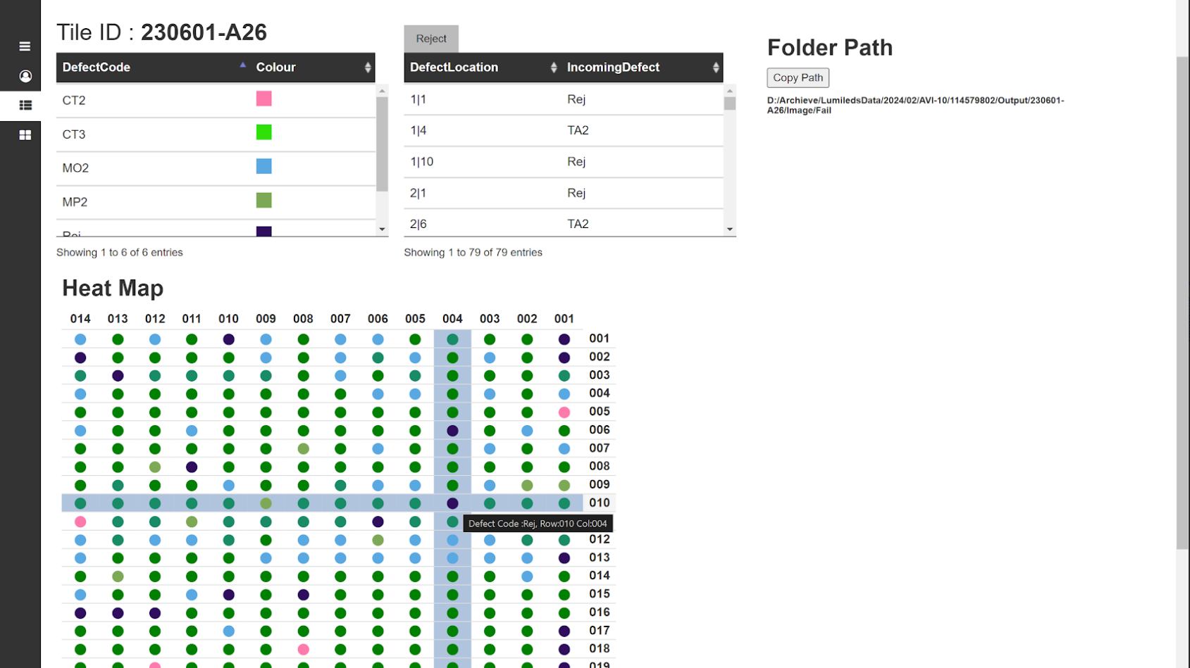 Our Automated Machine and Tile Data Inquiry System is designed to streamline the process of monitoring and analyzing machine and tile data. This system integrates with various types of machines, automatically gathering and uploading data to our centralized database. It allows users to easily check defect locations on produced tiles without manually inspecting each machine.